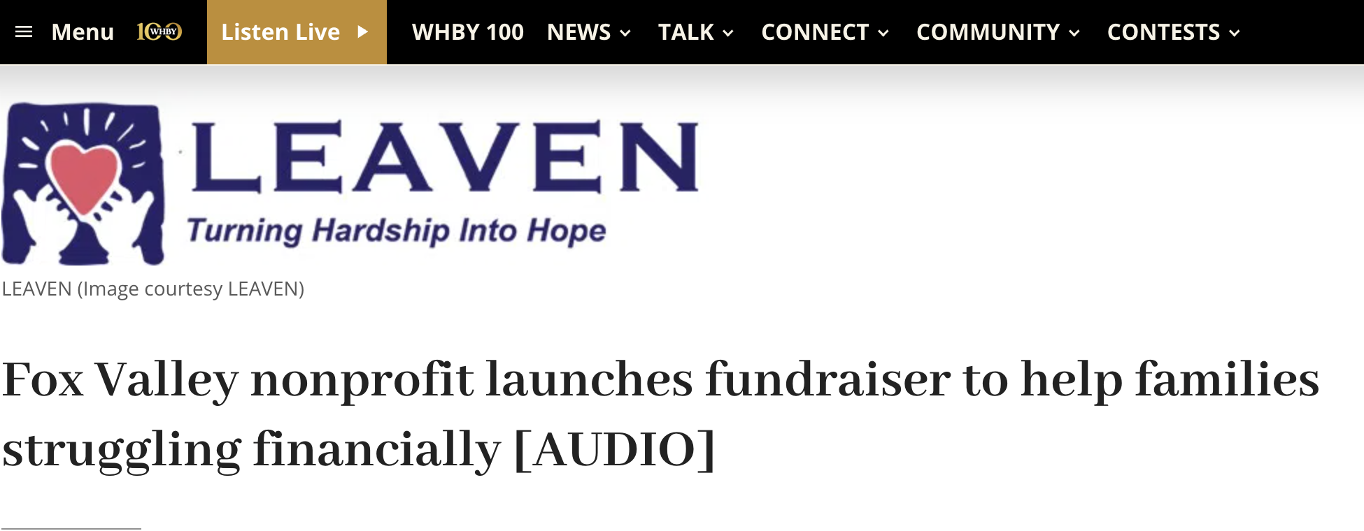 WHBY: Fox Valley nonprofit launches fundraiser to help families struggling financially Mar 5 Written By LEAVEN Fox CIties Executive Director Nikki Gerhard talks with WHBY about how just $40 can make a tangible difference for those who LEAVEN serves. Hear from Nikki 40 YearsMedia Coverage LEAVEN Fox CIties